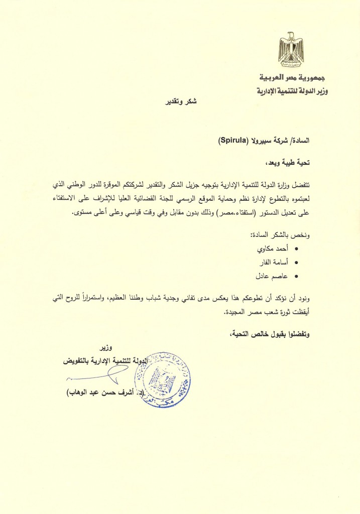 We would like to thank the Ministry of State for Administrative Development for giving us the opportunity to support the current Egyptian government, and we are always ready for more.