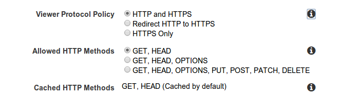 The next step, is to specify the cache behavior settings. The Viewer Protocol Policy can be: