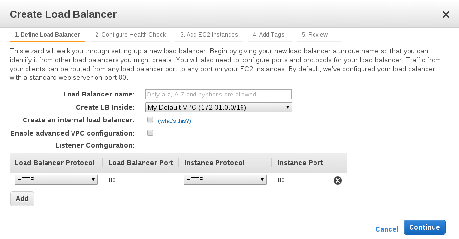 The default configuration creates load balancer for HTTP service which listens on port 80 and distributes traffic to port 80 on the instances.