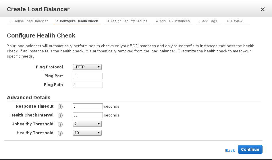 Select the ping protocol and the ping port. The default protocol is HTTP and the default port is 80. ELB uses ping port to send health check requests to EC2 Instances. If it is required to change the ping port, the EC2 instances must be configured to accept incoming traffic on this port specified for the health check.