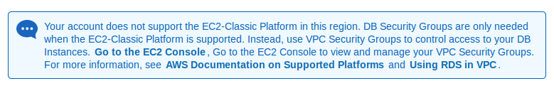 The first thing to be done before going through the steps of setting up RDS, is to create security group. From the RDS menu, “Security Groups” is selected. If the DB instance will be created in the Free Tier, the following message is displayed: