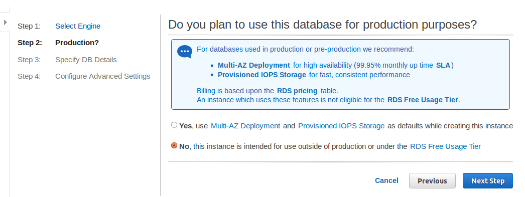 One of the important options of RDS is Multi-AZ deployment that can provide high availability of 99.95%. This option is suitable and recommended for production. Yet, it’s not available for Free Tier.