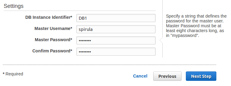 - DB Instance Identifier: Must be unique among all the DB instances created.