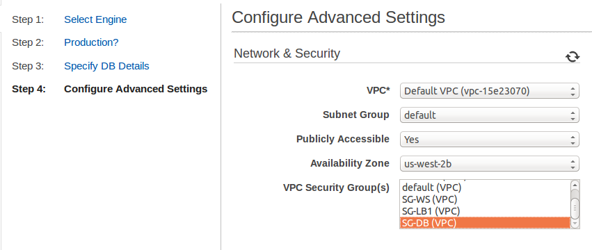 The alternative is to choose it to be publicly accessible, and restrict the access by the pre-configured security group which – by the way – can be modified any time. - Availability Zone: Choose the AZ where the Db instance will be created.