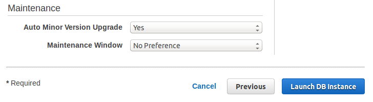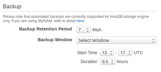 - Backup Window: If automatic backups are enabled, Amazon RDS asks for a time window (in UTC) when to create those backups.