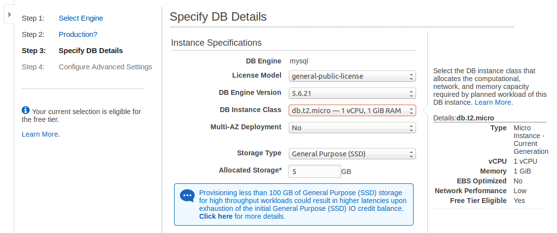 It opens another option, “Provisioned IOPS”. RDS MySQL supports IOPS/GB ratios between 3 and 10. - Magnetic storage, like the first type, the allowed minimum size is 5 GB, while the maximum is 3072 GB.