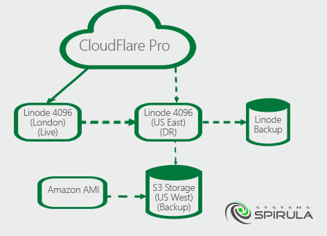• The DR site is a cloud instance of the same size as the main, located in US East – with the same provider – to ensure geographical distribution. The site acts as a slave for database and file system synchronization from the main site. During normal operations, this site is in standby mode.