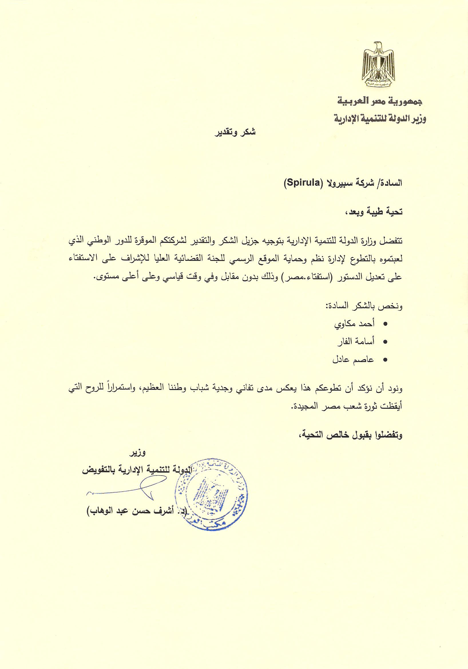 As Spirula Systems had a role in supporting some political opposition websites before the Egyptian revolution, we didn't hesitate to support the new Egyptian government when it was needed. Spirula Systems helped by securing and managing the server of the latest Egyptian referendum website. This was done because we believed that Egypt has reached the point where people and government should cooperate together to create a better future for our beloved country.